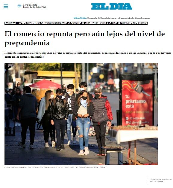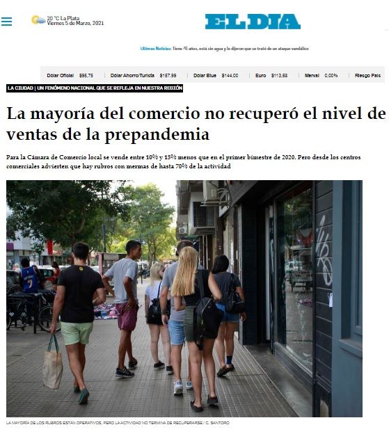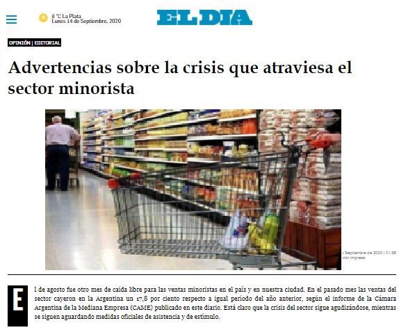 “Advertencias sobre la crisis que atraviesa el sector minorista” es el título de la nota editorial del diario El Día de La Plata, que plantea la inquietante realidad que enfrenta el comercio local. Con datos estadísticos que grafican la situación, en medio de la pandemia y la cuarentena extendida, el artículo también refleja la opinión de nuestra Cámara y las propuestas que formulamos oportunamente.