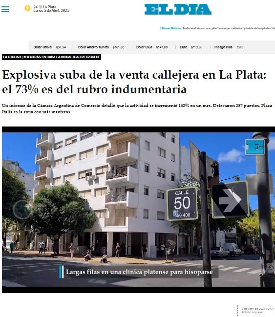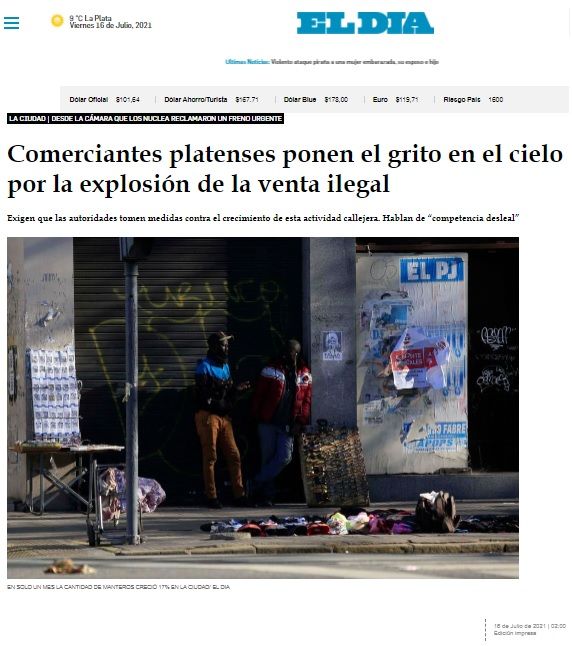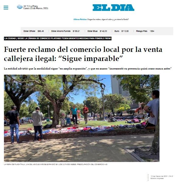 “La falta de operativos y controles por parte de las autoridades municipales, provinciales y nacionales dan vía libre a esta práctica que configura una clara competencia desleal, donde el perjudicado es quien tiene su negocio en regla, cumple con todas las obligaciones y genera los puestos de trabajo tan necesarios en momentos de incertidumbre como el que atravesamos”, señaló, a mediados de marzo y a través de un comunicado, la Cámara de Comercio e Industria de La Plata.
